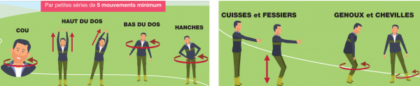 Pour s’échauffer : pratiquer des petits exercices d’échauffement et de réveil musculaire avant l’effort (voir illustrations ci-dessus).