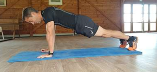 - Une séance de renforcement musculaire de 20 min de gainage hebdomadaire est recommandée. Par exemple, la planche est le classique du gainage (voir illustration ci-dessus): face au sol, bras et jambes tendus, tenir la posture en gardant le dos plat, les épaules basses et la nuque dans le prolongement de la colonne vertébrale, abdominaux gainés (3 séries de 15 secondes). Pensez à vous échauffer avec 5 min d’exercices.